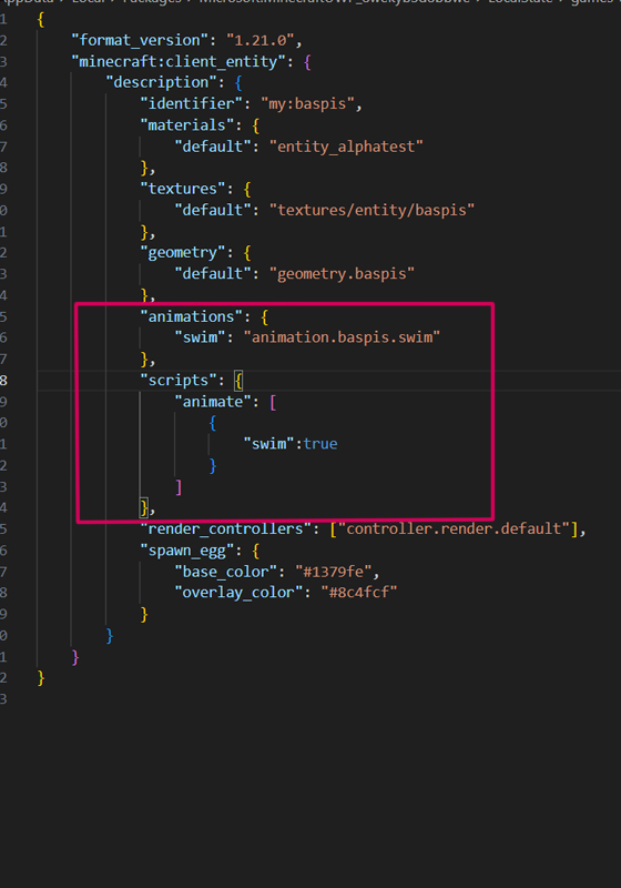 さらに、entity.jsonファイル内でアニメーションを呼び出す設定を行います。